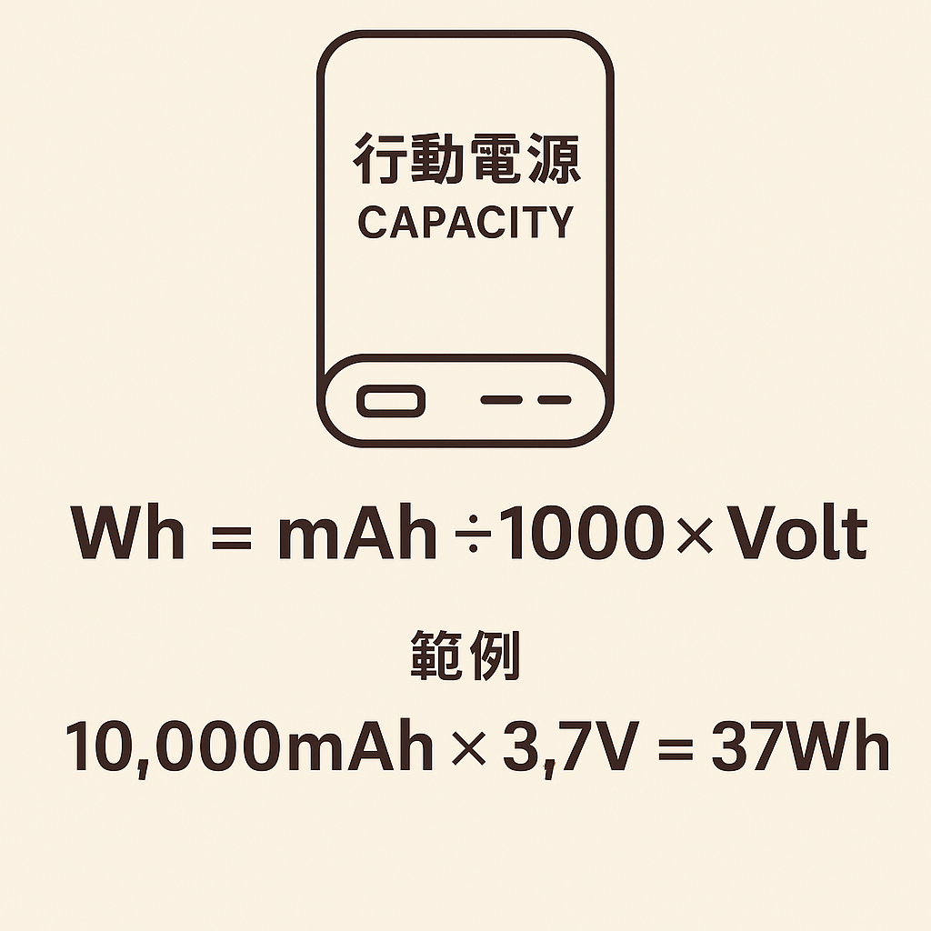 - 範例: 一個10000毫安培(mAh)的行動電源,標註電壓為3.7v,定額能量則為 10000 (mAh)/1000 x 3.7(v) = 37 (Wh)。