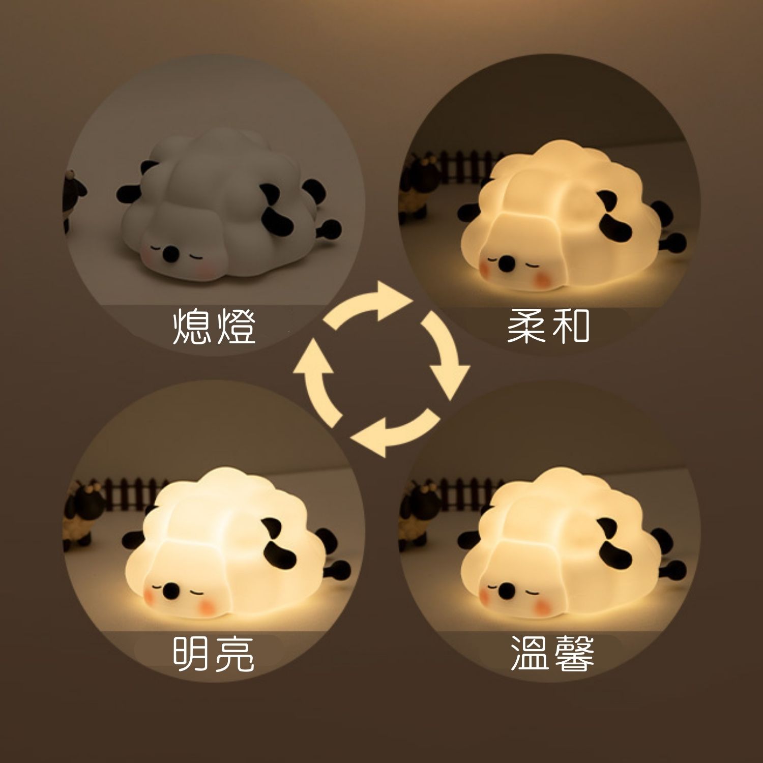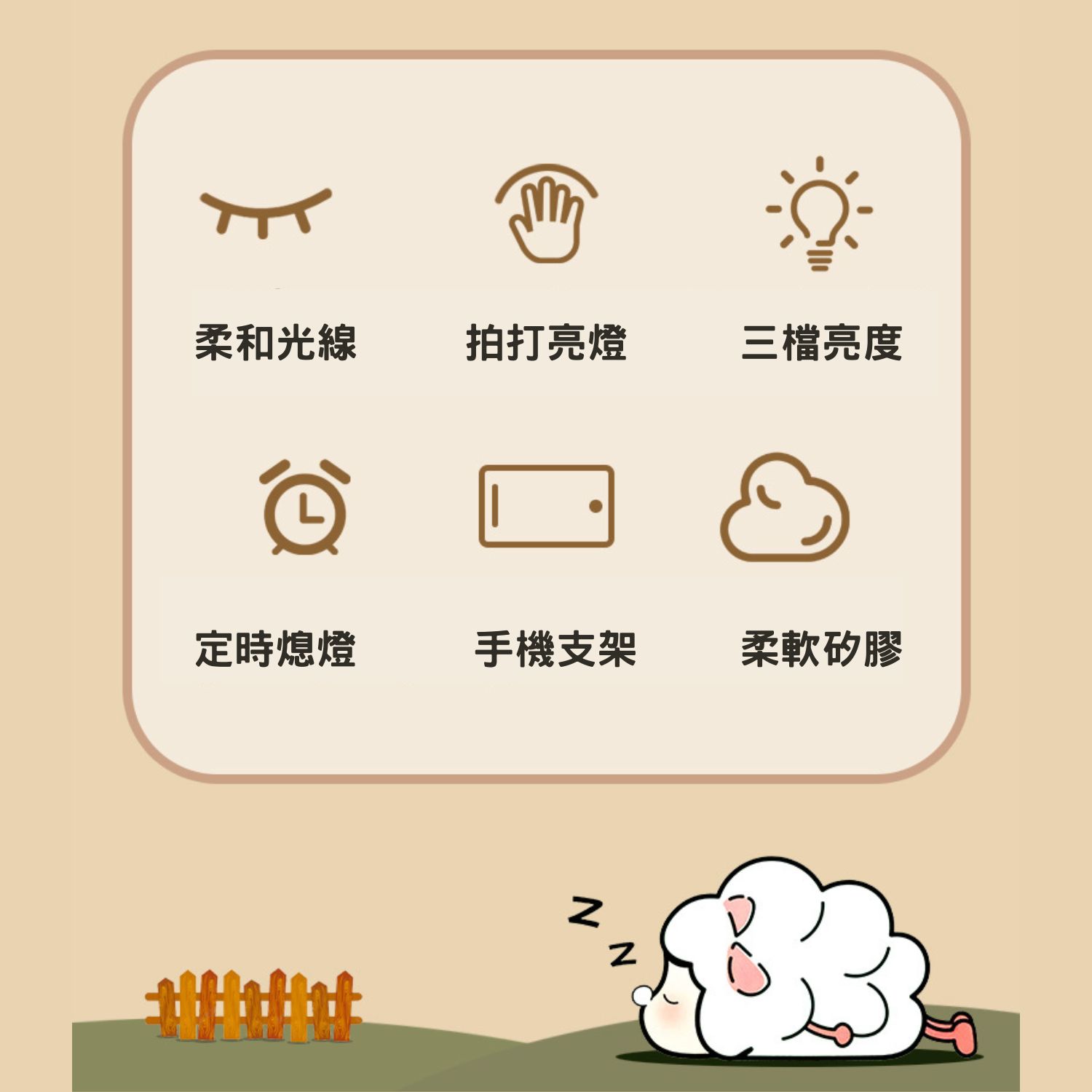 安心綿羊小夜燈以可愛造型散發柔和光芒,滿足你對夜晚的所有想像。具備三檔調光功能,不僅是夜燈,更是讀書、放鬆的完美選擇。